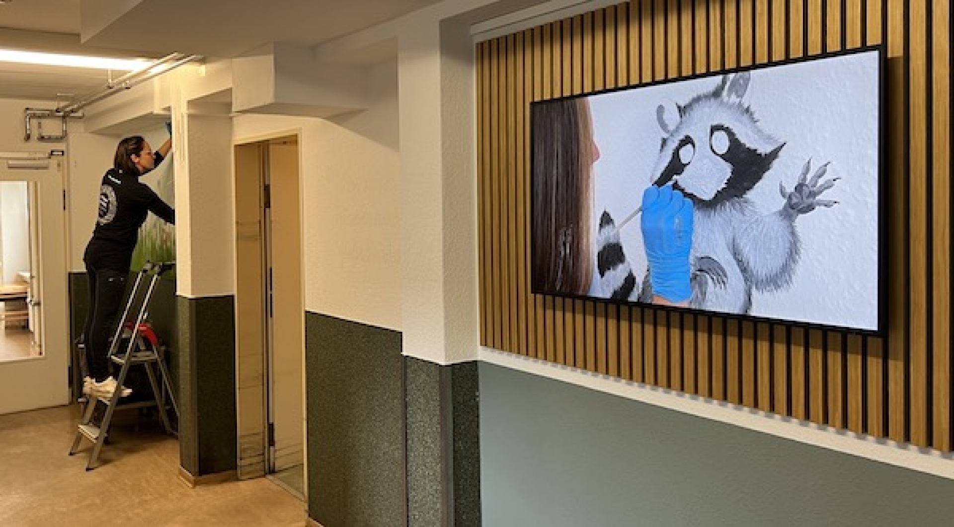 Während unsere Sonnika liebevoll Tiere, Wasser, Bäume und Kleintiere auf die Wände brachte, realisierten unsere IT-Abteilung 2 Displays in den jeweiligen Fluren. Diese Displays starten und beenden ihren täglichen Dienst vollautomatisch. Unsere Verwaltungssoftware macht die Administration der Inhalte einfach.